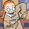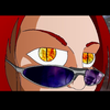 Description: A close-up of the face of a vampire with bobbed red hair and snakelike eyes peering over narrow black sunglasses. Original art by Zane Graves.