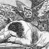 Description: An Excerpt from The Sleep of Reason Produces Monsters by Francisco Goya. It shows a man sleeping, head down on his desk, with monsters arising from his mind to torment him.